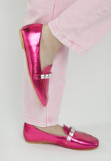 The metallic pleather loafer is a truly exquisite piece. It features a stunning diamante-embellished strap, plush cushioned insoles, and comfortable flat heels. Ideal for pairing with evening gowns, tailored trousers, and everything in between, these closed-square-toed loafers offer unparalleled versatility.
