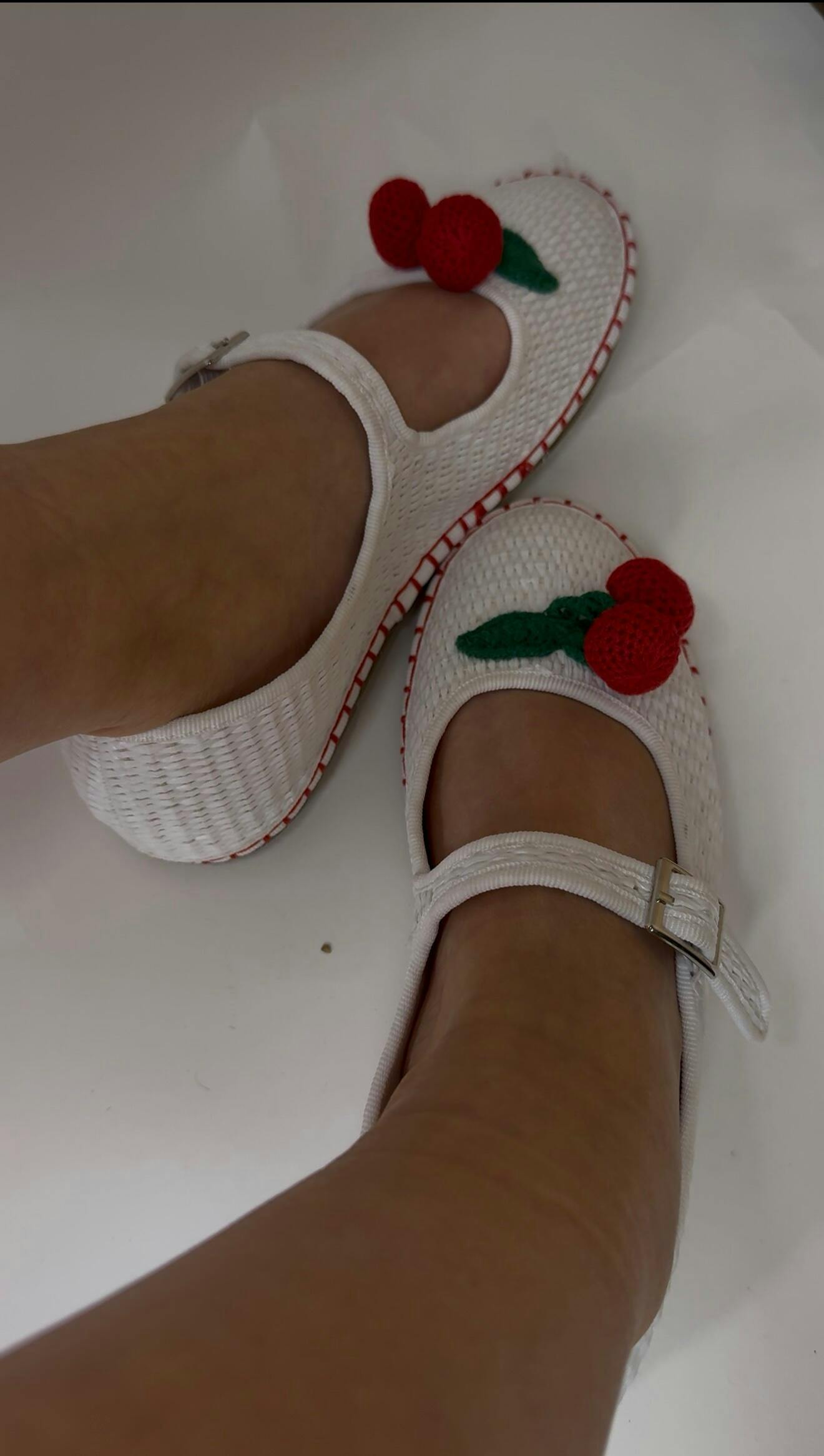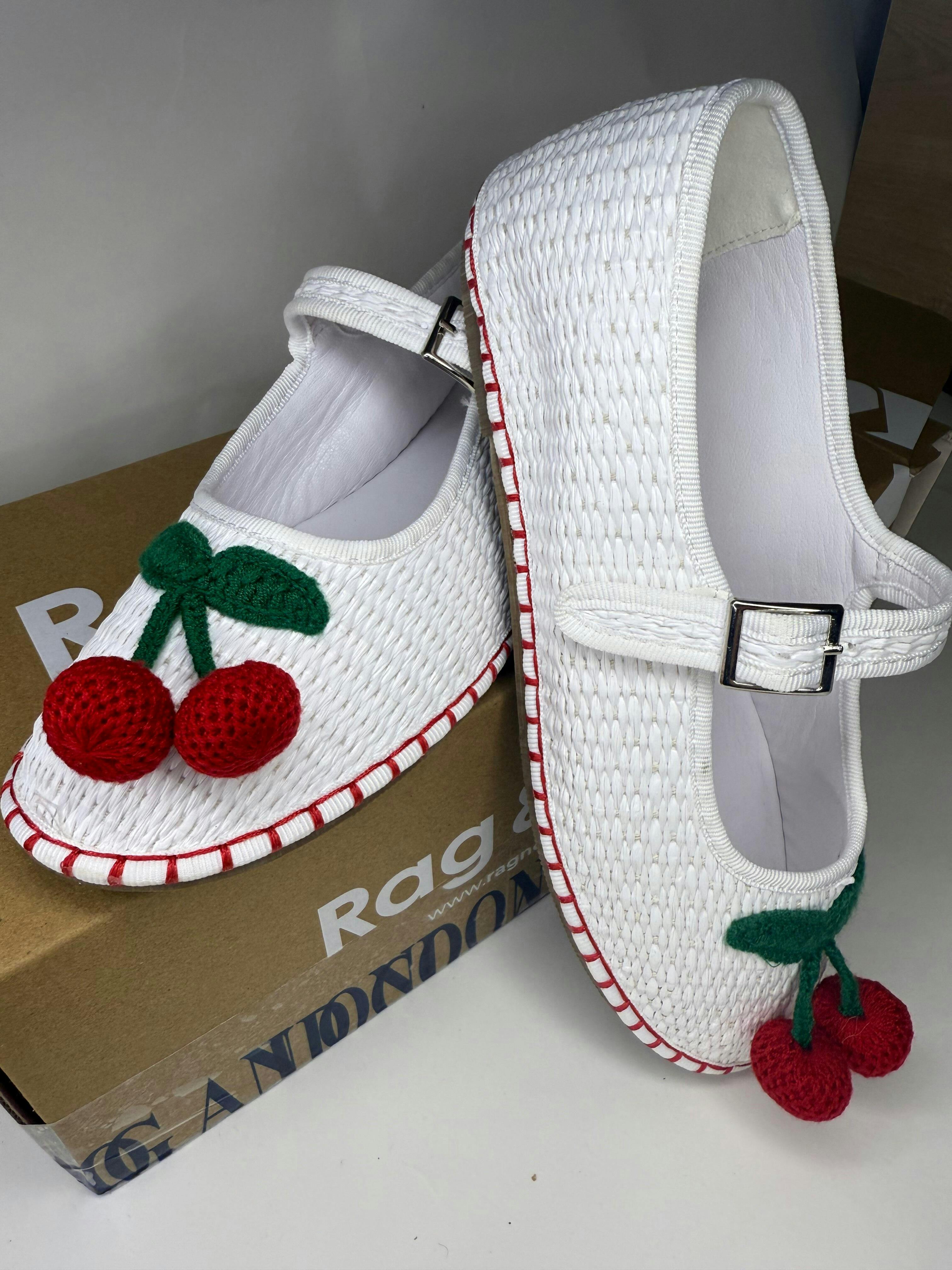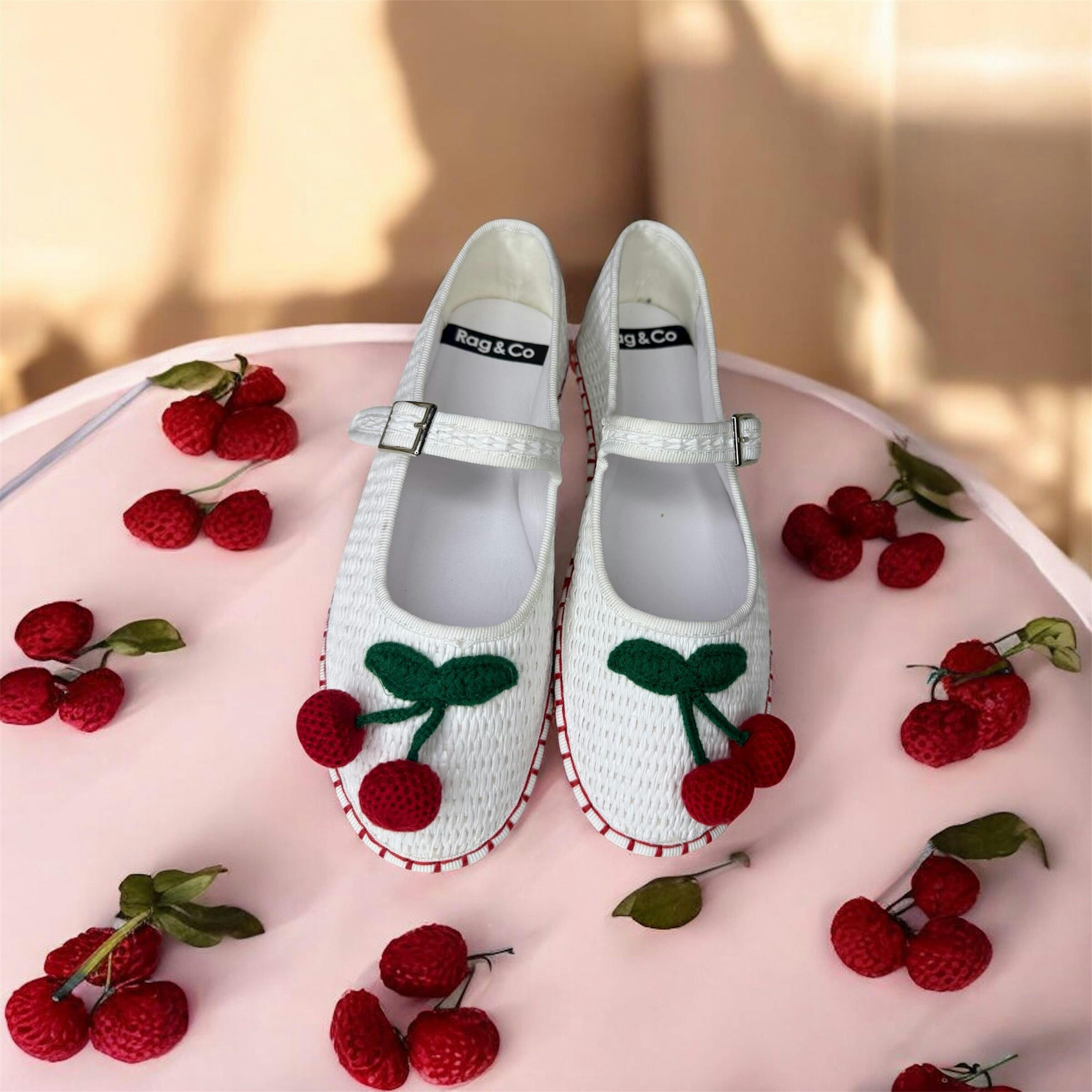 Sweet meets structured in these woven Mary Jane flats, detailed with a playful cherry embellishment. The flat heel keeps it comfortable all day, while the pin buckle strap offers a secure, classic fit. Perfect for adding some fun and love to your summer denim and skirts.